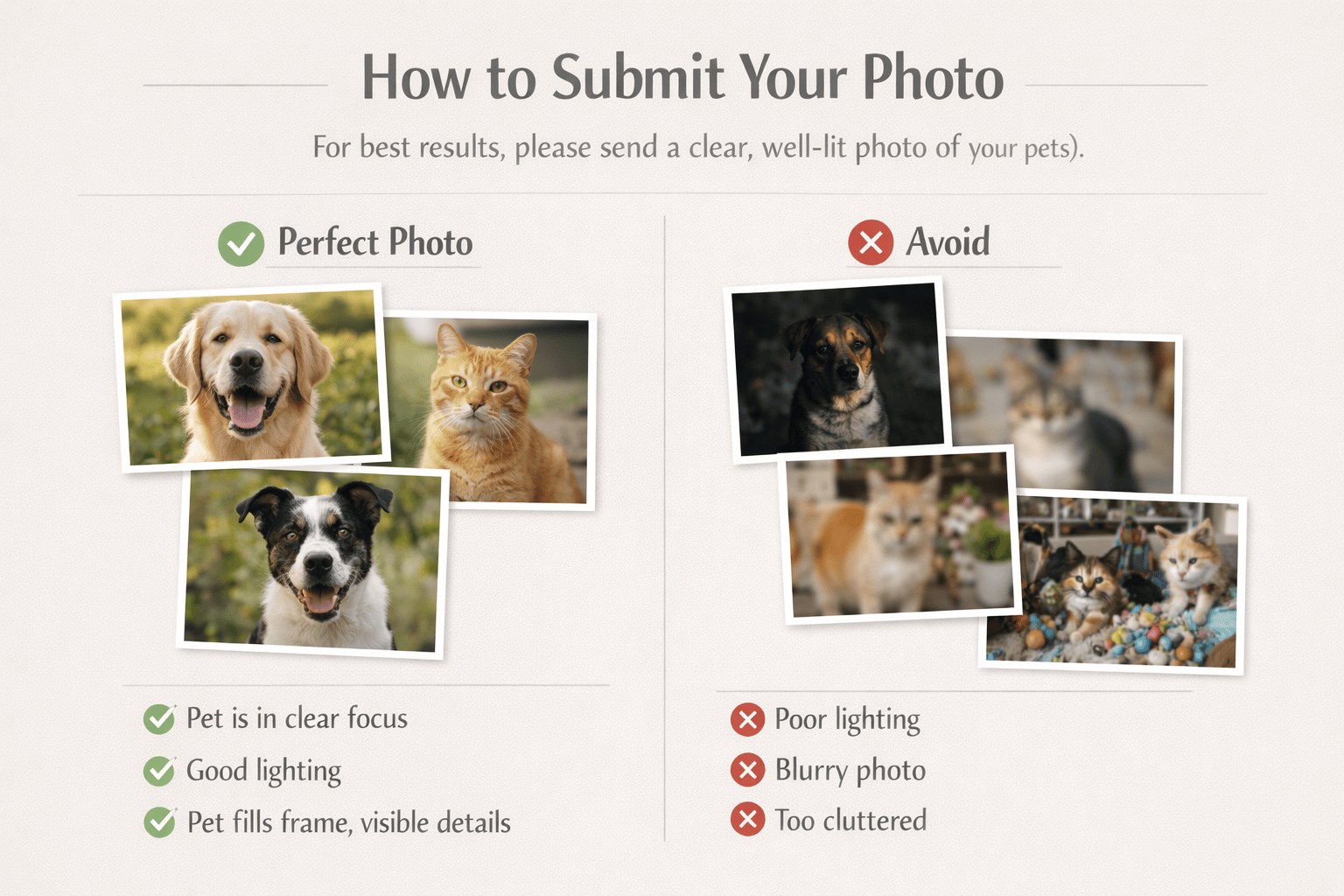 Upload a clear photo of your dog or cat, and our artists will recreate their unique features while keeping the design warm, friendly, and timeless.